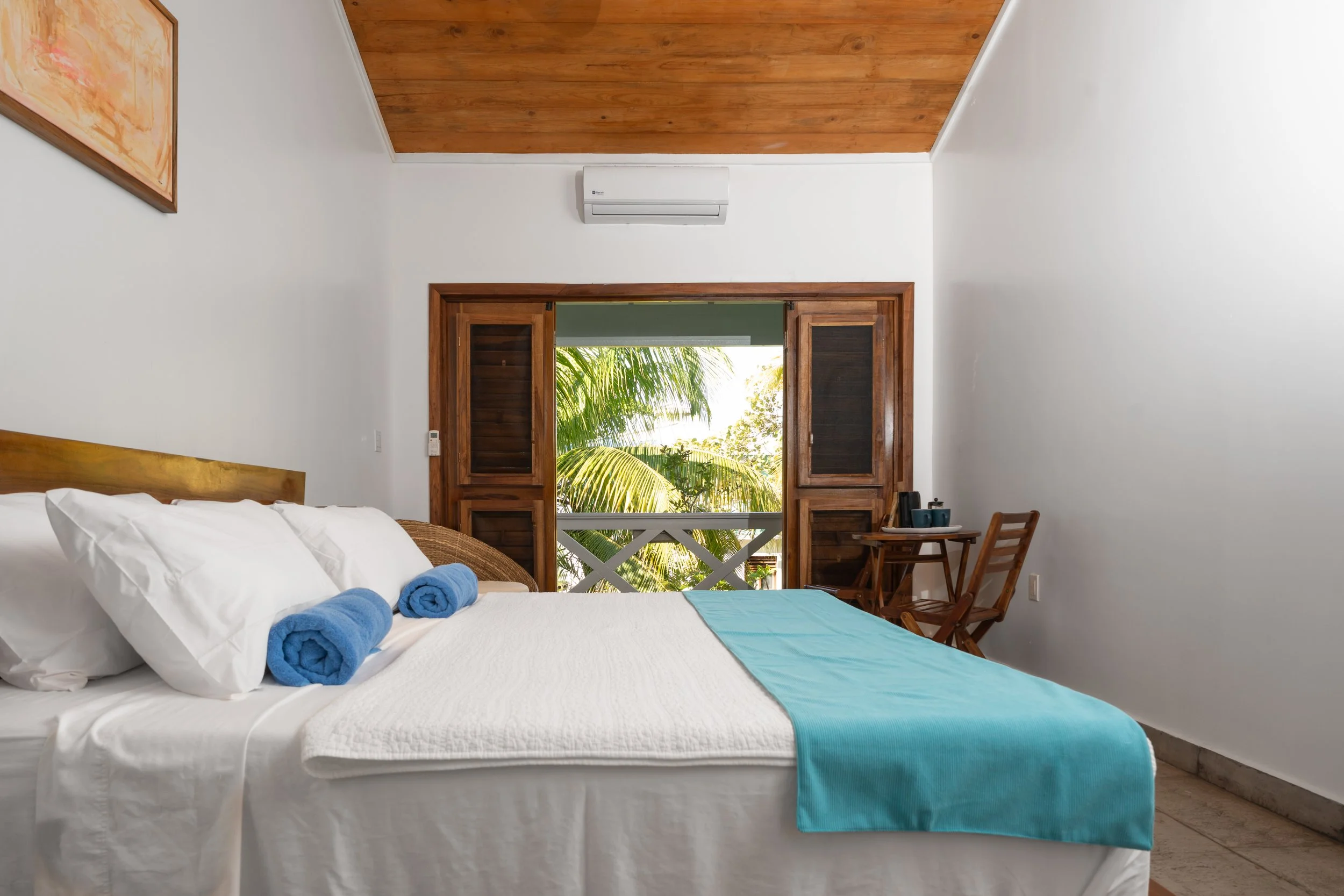 The room features a queen bed, a private bathroom finished with handcrafted Honduran tiles and a custom-made sink, and a mini-fridge for added convenience. From this elevated corner of the property, you can enjoy peaceful views of the garden, the mangrove forest, and a side glimpse of the Caribbean Sea.